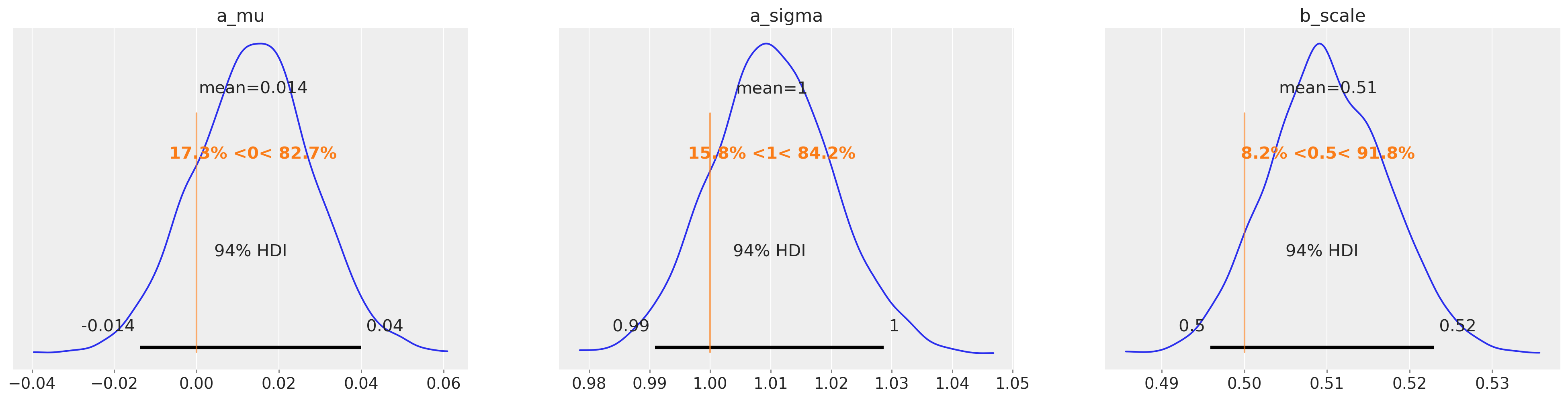 marginal_idata, var_names=["a_mu", "a_sigma", "b_scale"], ref_val=[0, 1.0, 1 / 2.0]