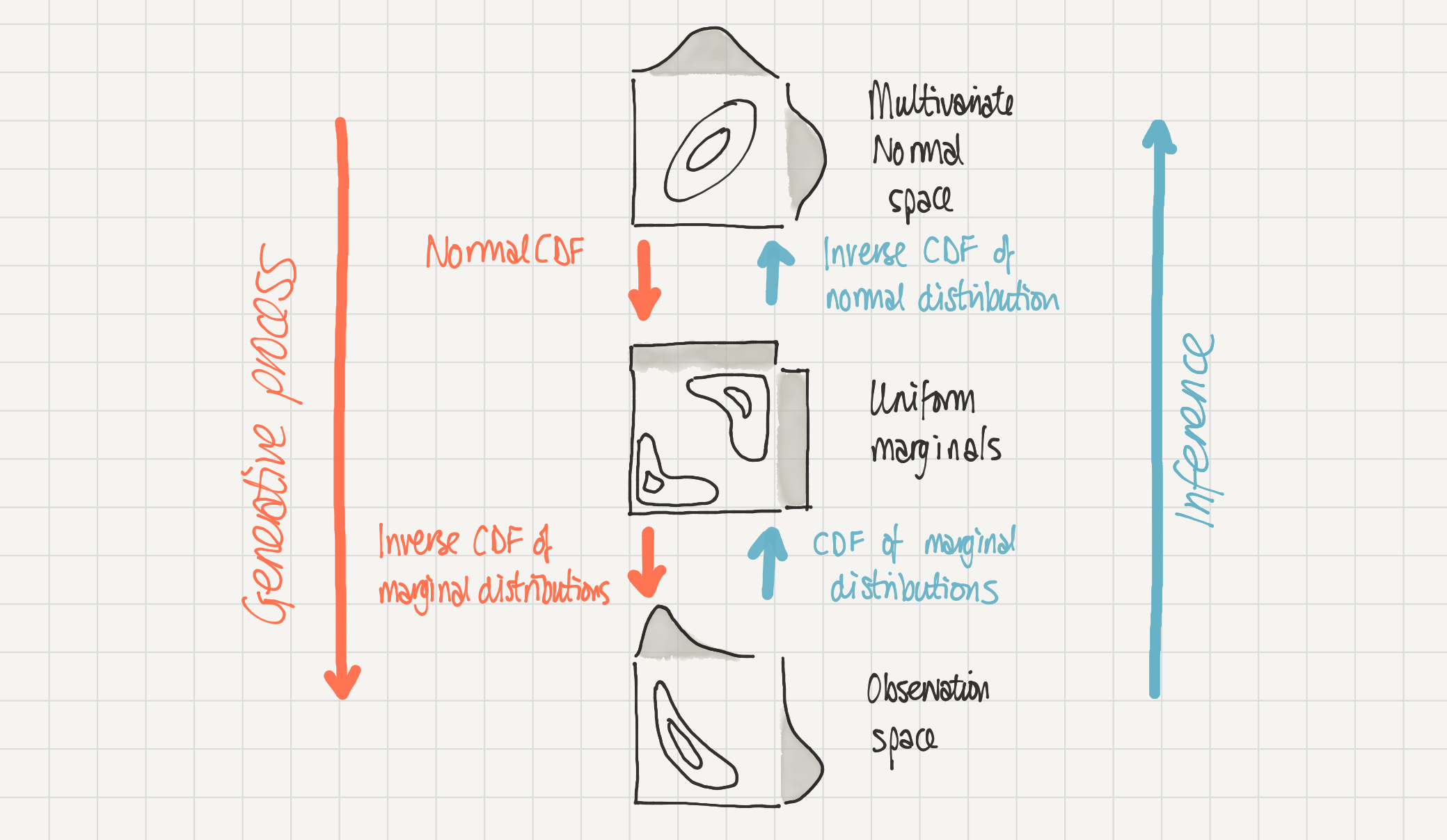 Before diving in to inference, we will spend some time fleshing out the steps in the schematic figure above. First, we will demonstrate the generative model by describing a multivariate normal copula and transform that into observation space. Second, we show how the inverse transformations can allow use to move back from observation space to multivariate normal space. Once we have these details pinned down, we proceed to the inference process in a later section.