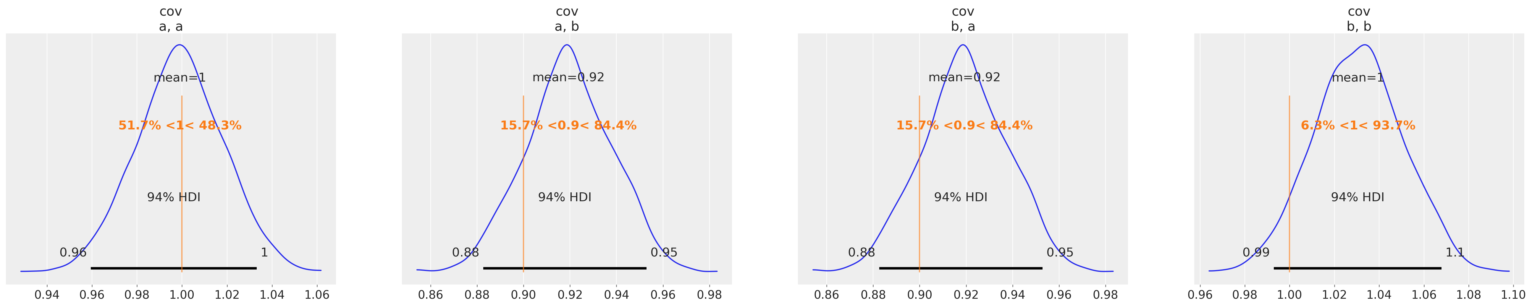 az.plot_posterior(copula_idata, var_names=["cov"], ref_val=[1.0, θ["rho"], θ["rho"], 1.0]);