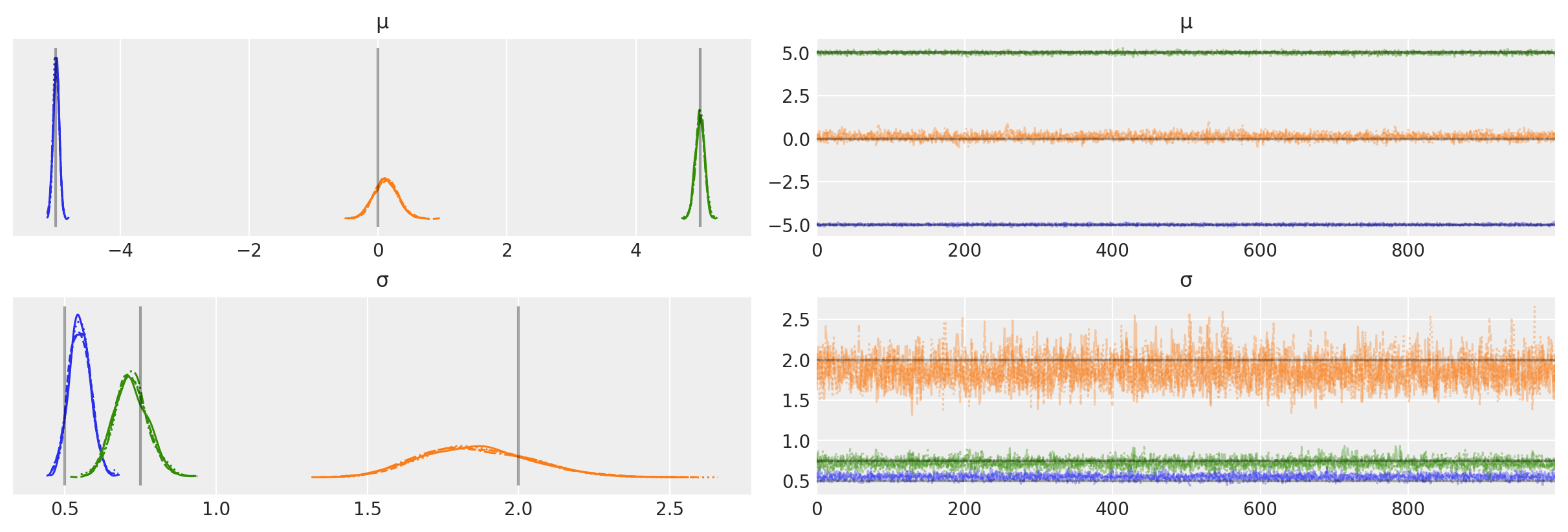 az.plot_trace(idata, var_names=["μ", "σ"], lines=[("μ", {}, [centers]), ("σ", {}, [sds])]);