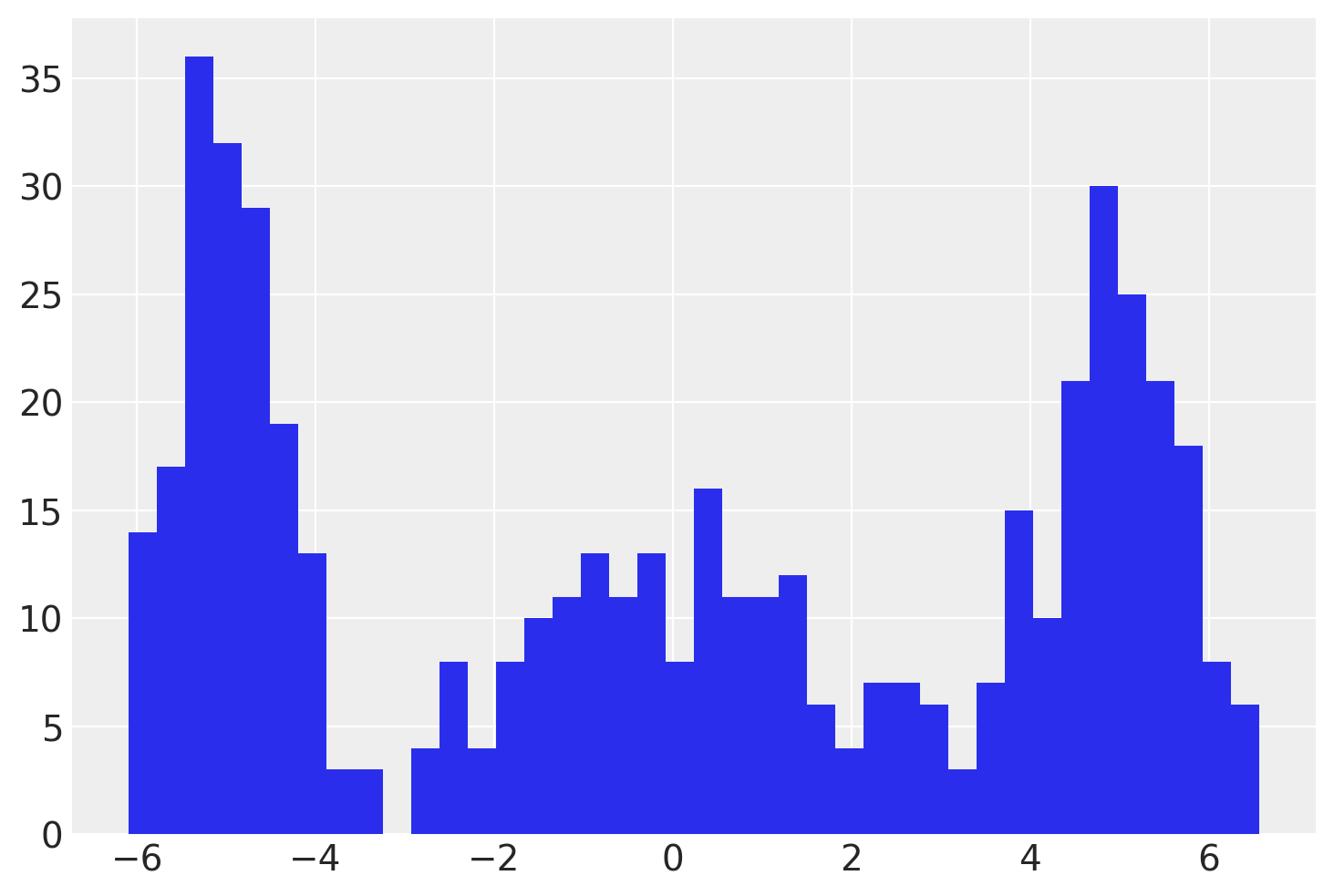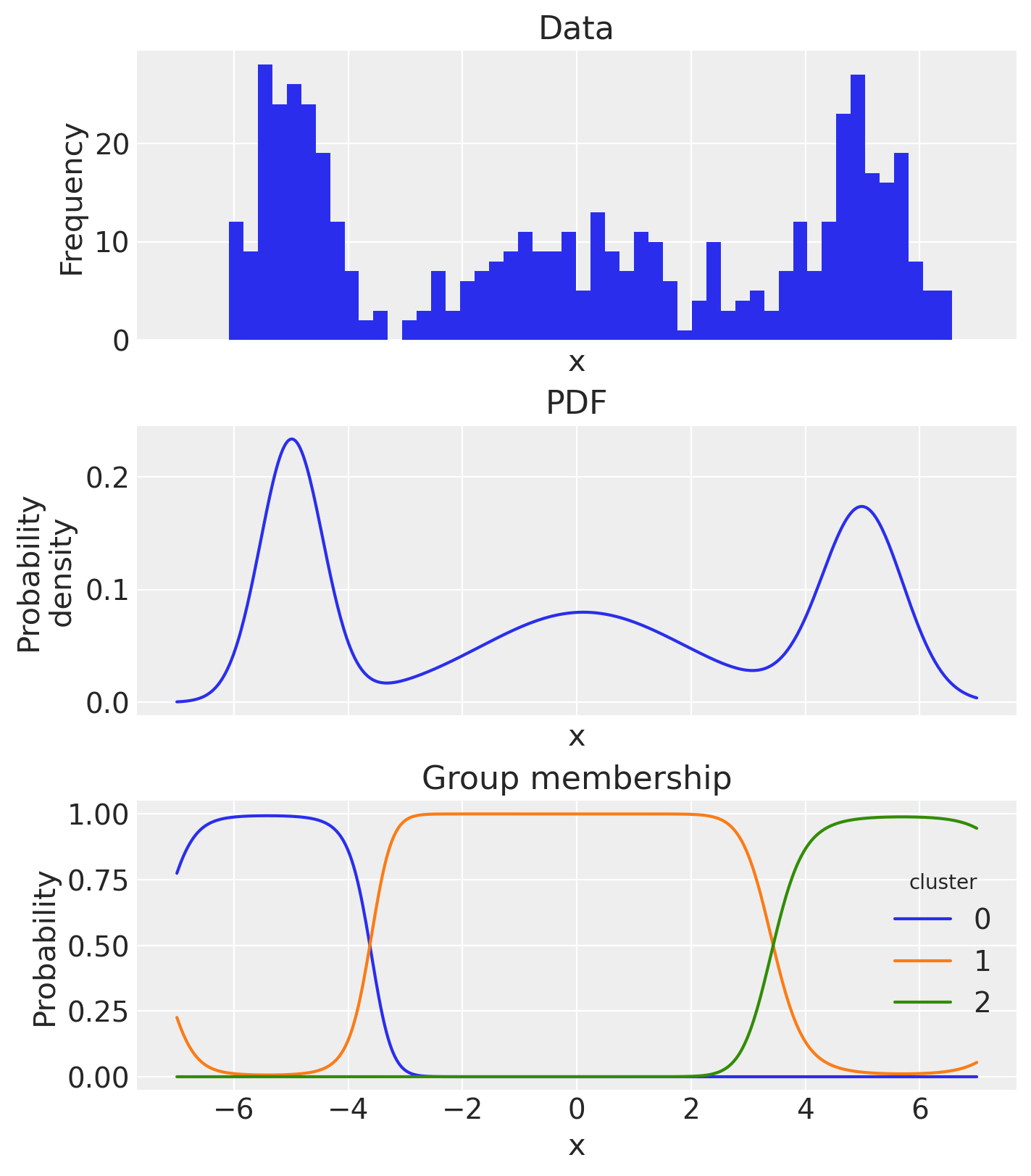 In the PyMC model, we will estimate one \(\mu\) and one \(\sigma\) for each of the 3 clusters. Writing a Gaussian Mixture Model is very easy with the pm.NormalMixture distribution.