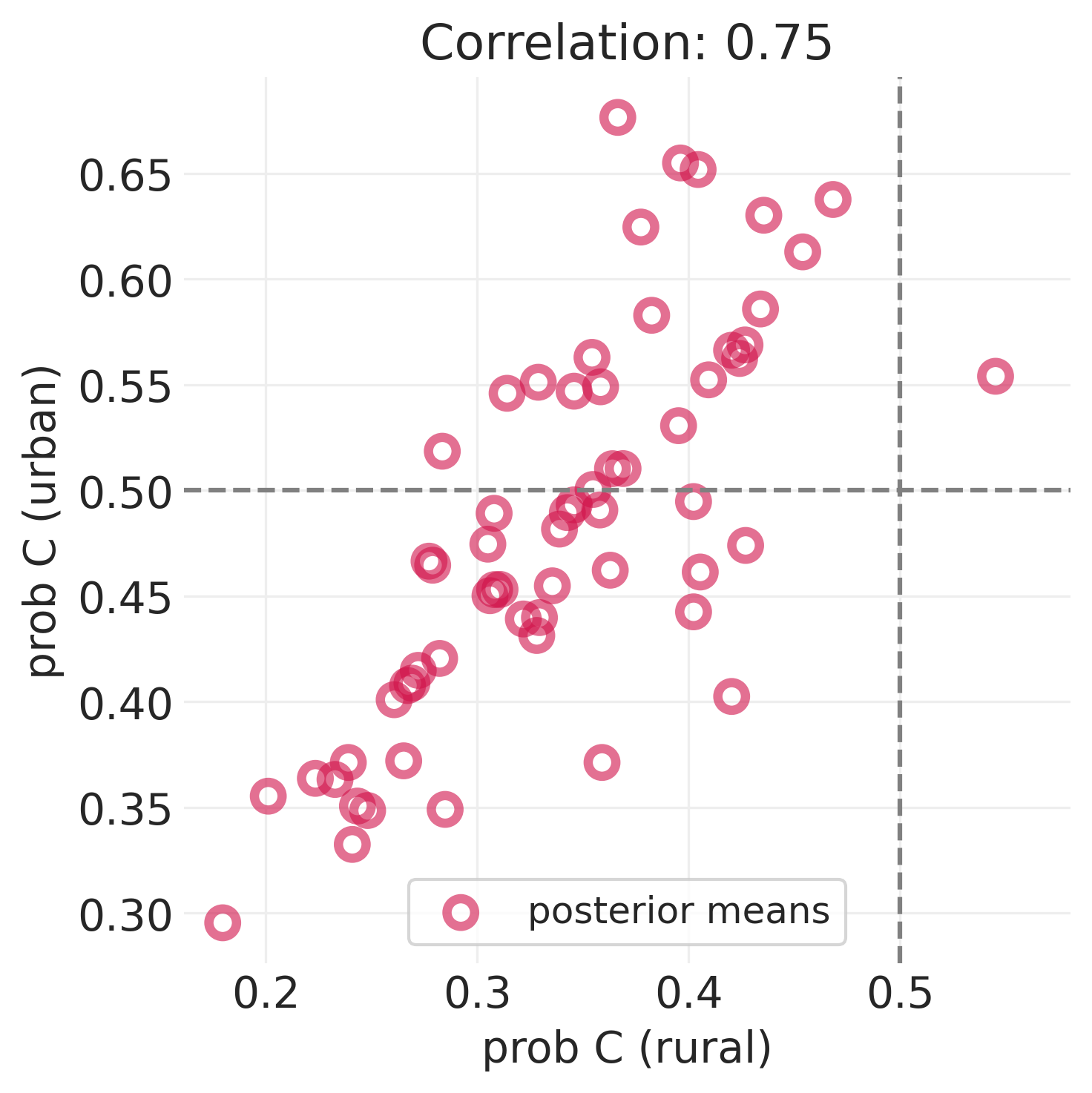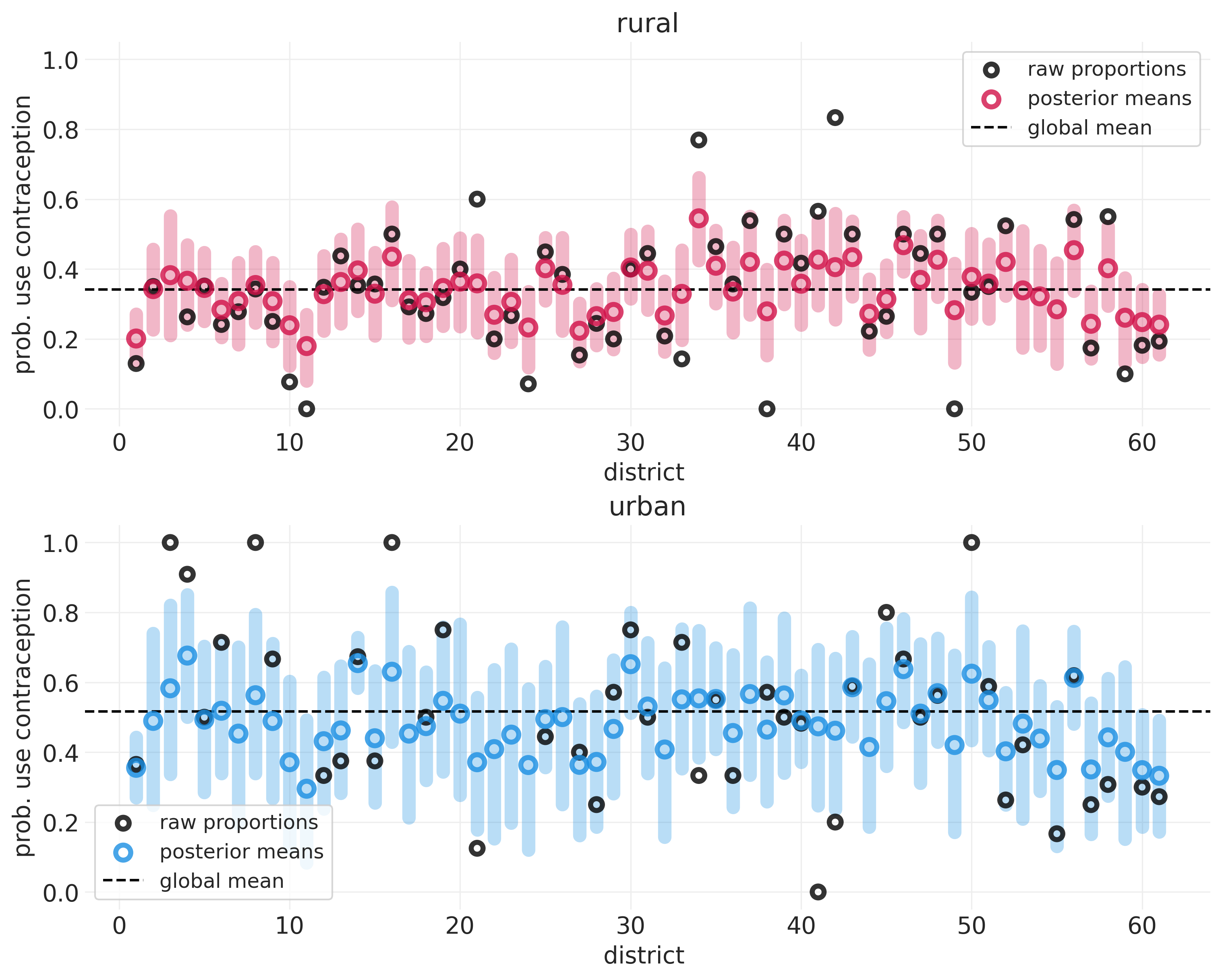 Below we show the contraceptive use for rural (only including a district-level intercept \(\alpha_{D[i]}\)) vs urban (including an additional intercept \(\beta_{D[i]}\) for urban districts) groups. These plow was generated in Lecture 13 - Multilevel Adventures.