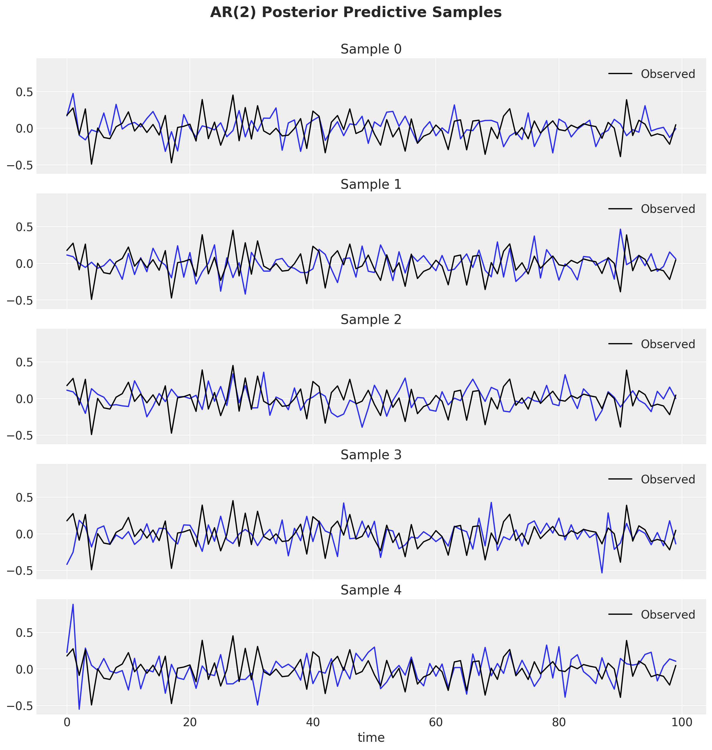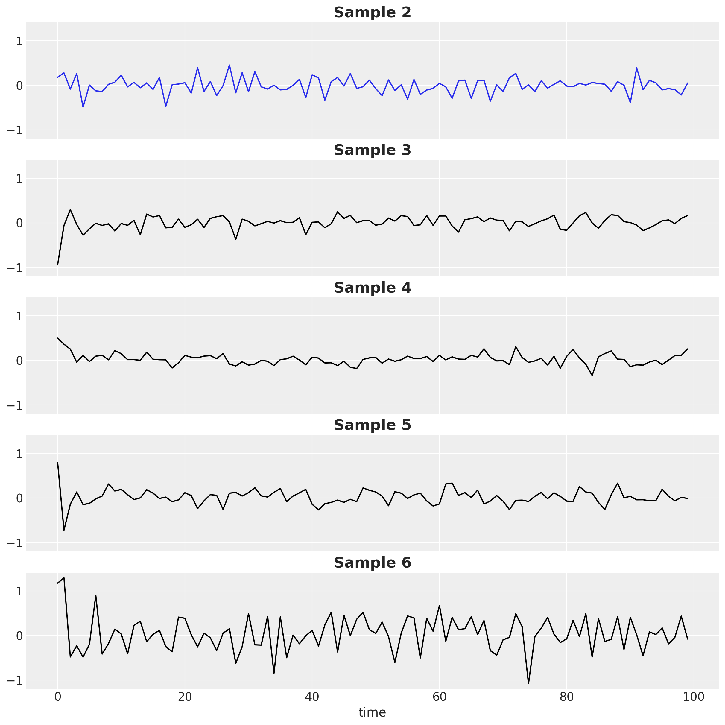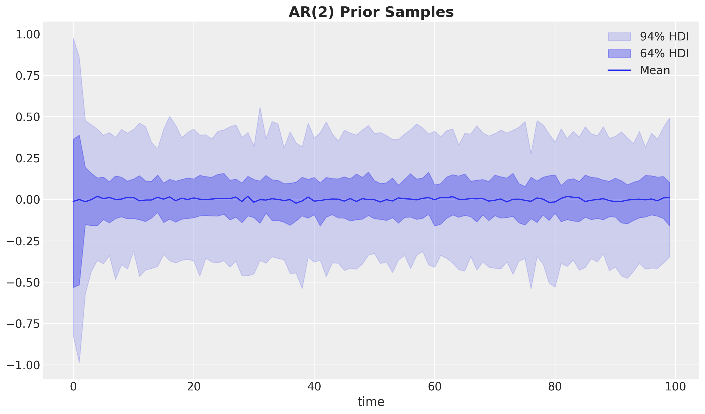 Let’s sample from the prior distribution to see how the AR(2) model behaves.