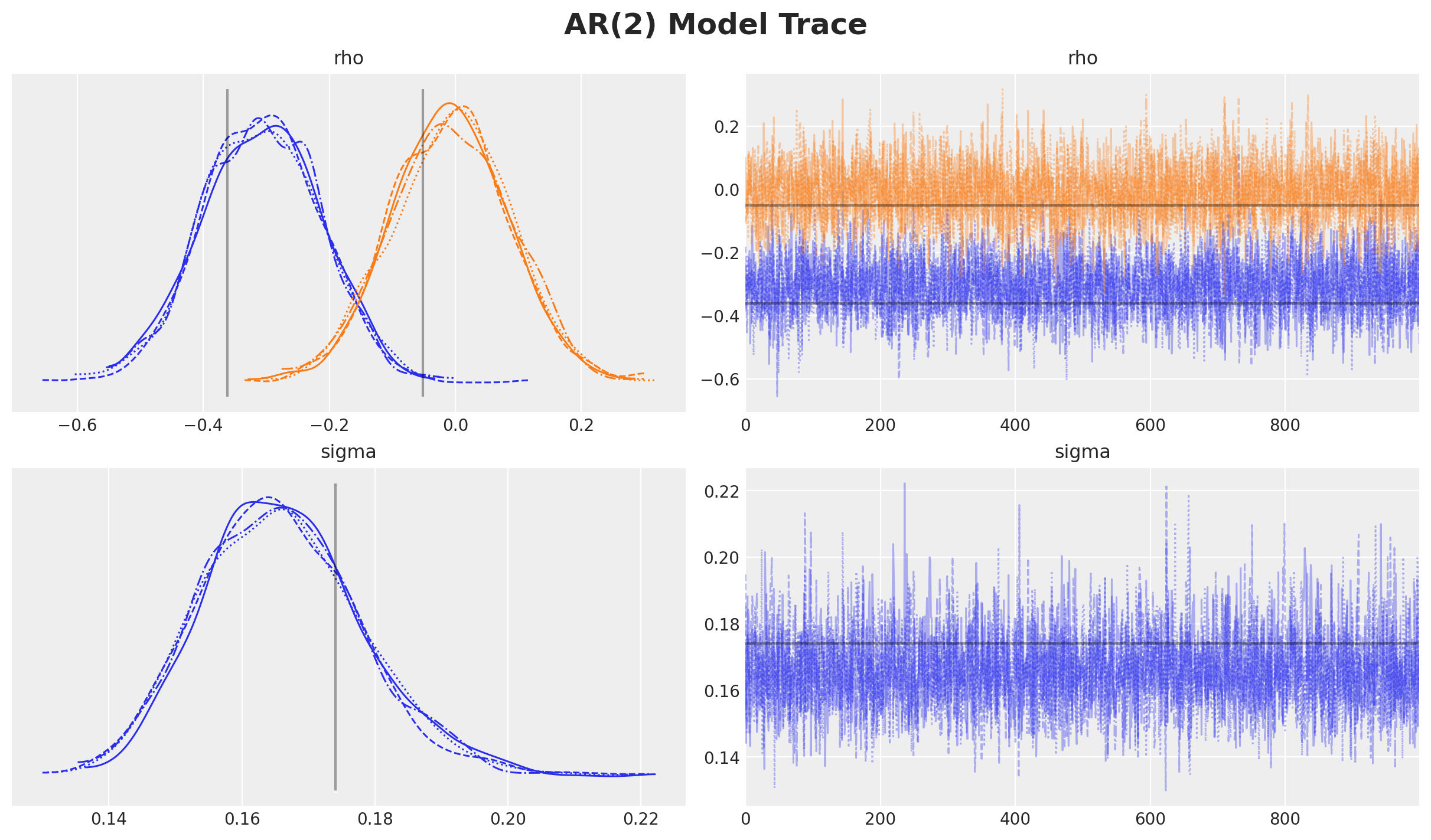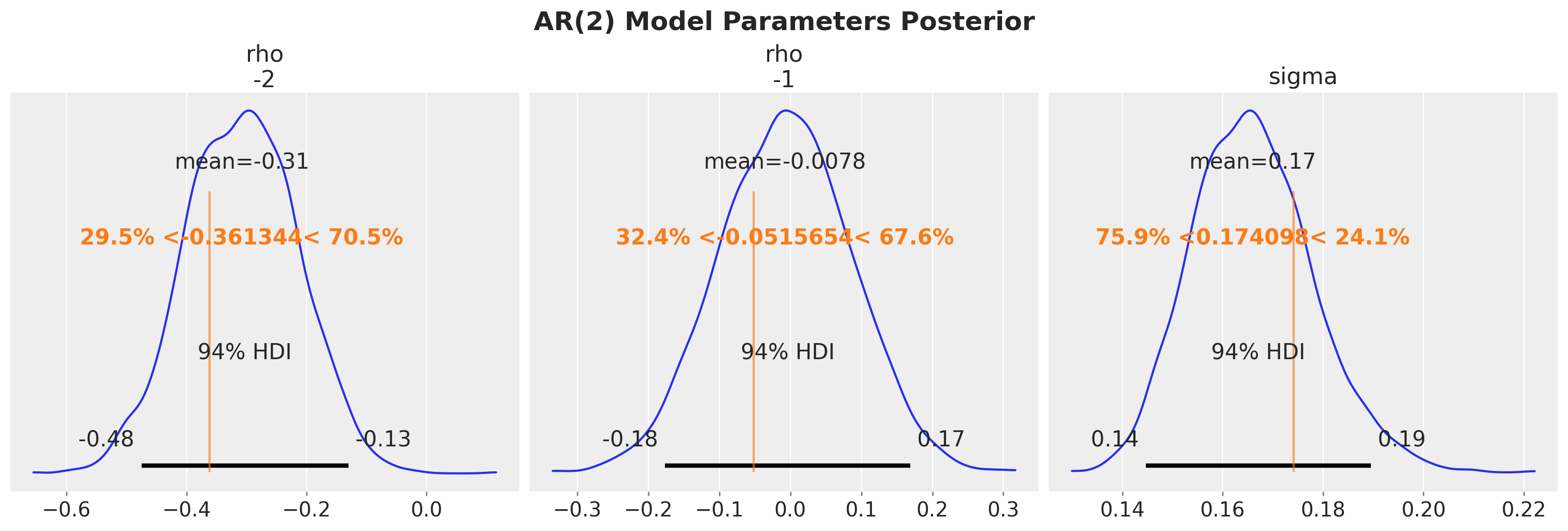 Now that we have implemented the AR(2) step, we can assign priors to the parameters rho, sigma and the initial state ar_init.